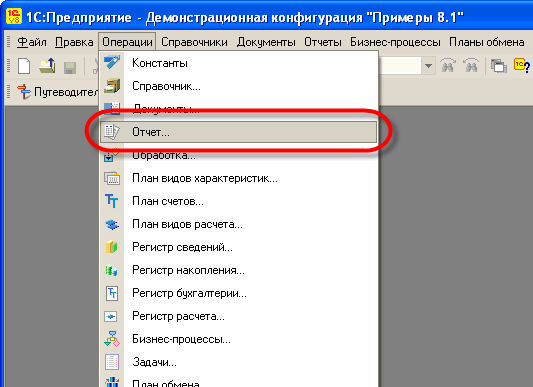В открывшемся окне 1С:Предприятия выберем в главном меню пункты Операции->Отчет.
