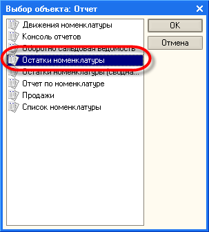 В появившемся списке отчетов выберем наш отчет - "Остатки номенклатуры" и нажмем кнопку ОК.