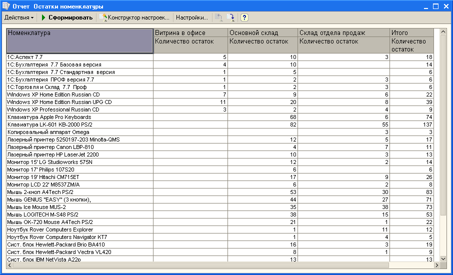 В этой статье будет рассмотрен пример создания отчета по остаткам номенклатуры на складах.