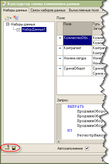 Если в конфигурации уже имеется готовая схема компоновки данных, то эту схему можно перенести в консоль компоновки, сохранив ее в конфигураторе в файл и загрузив ее из файла в конструкторе схемы компоновки данных, открытого из консоли.