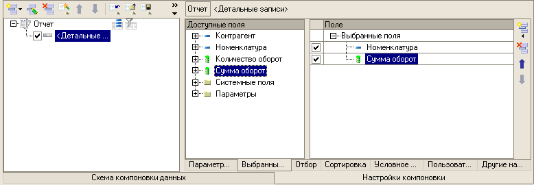 После того, как схема компоновки данных готова, нужно сделать настройки отчета. В консоли схемы компоновки данных настройки редактируются на закладке "Настройки компоновки".