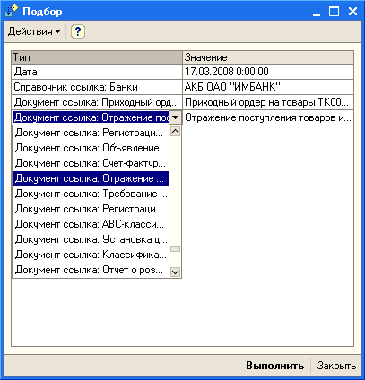 В некоторых случаях требуется организовать ввод данных произвольного типа в колонки табличного поля. Причем тип данных, которые будут вводиться в колонку табличного поля, заранее неизвестен. Например, пусть необходимо создать форму подбора, позволяющую выбирать значения произвольного типа. Причем тип выбираемого значения заранее неизвестен и выбирается из заранее сформированного списка доступных типов. Выбранные значения необходимо поместить в таблицу значений. Для решения данной задачи необходимо уметь выбирать тип из списка доступных типов и на основании выбранного типа динамически изменять тип редактируемого значения в элементе управления, расположенном в колонке табличного поля, отображающей выбранное значение. Особенность элементов управления, расположенных в колонках табличного поля, состоит в том, что тип редактируемого значения можно изменять только для колонок табличного поля, не связанных с данными. Поэтому реализация данной задачи имеет некоторые особенности.