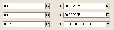 Для полей ввода с типом значения Дата предусмотрено автоматическое заполнение частично введенной даты и времени. Автоматическое заполнение производится при нажатии клавиши "Enter" или переходе на другой элемент управления. в том случае, если в поле ввода было введено неполное значение даты или времени, таки образом, чтобы поле ввода содержало корректное значение.