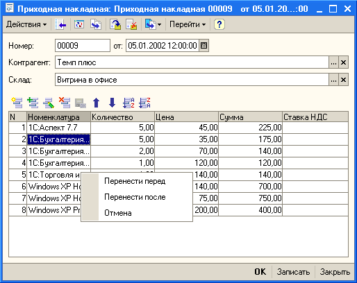 Поясним использование контекстного меню на следующем примере. Пусть существует форма документа "ПриходнаяНакладная", содержащая табличную часть "Состав". Требуется осуществлять перемещение строк табличной части при помощи мыши, причем вставку перемещаемой строки необходимо осуществлять до или после выбранной строки табличной части.