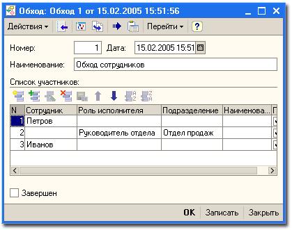 Приведенный в демонстрационной конфигурации бизнес-процессы пример бизнес-процесса "Обход" показывает последовательный обход сотрудников по заранее сформированному списку на основе условного зацикливания бизнес-процесса.