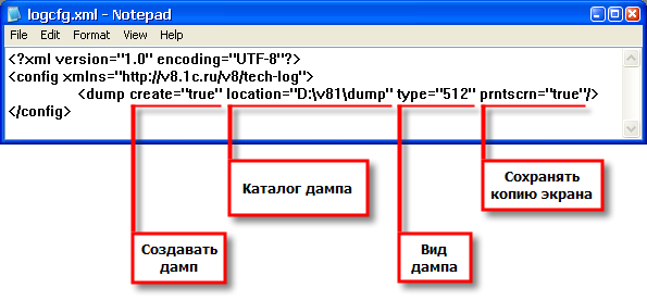 Например, следующий текст указывает, что при аварийном завершении будут создаваться дампы (create="true") памяти всего доступного адресного пространства (type="512"), которые будут помещены в каталог D:\v81\dump (location="D:\v81\dump"). При этом также будет создаваться файл копии экрана (prntscrn="true").
