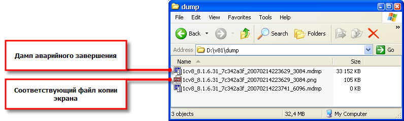 При аварийном завершении клиентской части 1С:Предприятия возможно автоматическое создание файла копии экрана. Такой файл создается в том же каталоге, что и дампы технологического журнала. Имя файла совпадает с именем файла дампа, а расширение - png.
