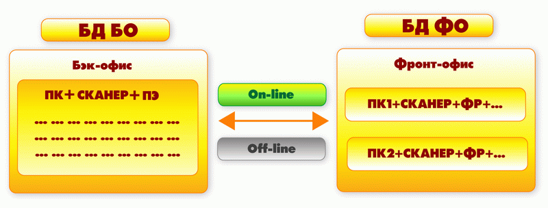 В рамках одного торгового комплекса принято разделять работу фронт-офиса и бэк-офиса. В задачи фронт-офиса входит автоматизация рабочих мест, которые в своей работе связанны с действиями над товарами или взаиморасчетами с покупателями. В задачи бэк-офиса входит подготовка данных для бесперебойной работы фронт-офиса, а так же обработке информации полученной при его работе.