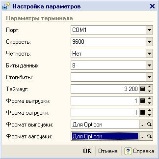 В форме настройки необходимо указать параметры подключения и обмена данными, особо обратив внимание на номера таблиц обмена ТСД (формы выгрузки и загрузки; нумерация идет с 0), а также форматы выгрузки и загрузки (должны быть настроены в соответствии с задачей в терминале сбора данных).