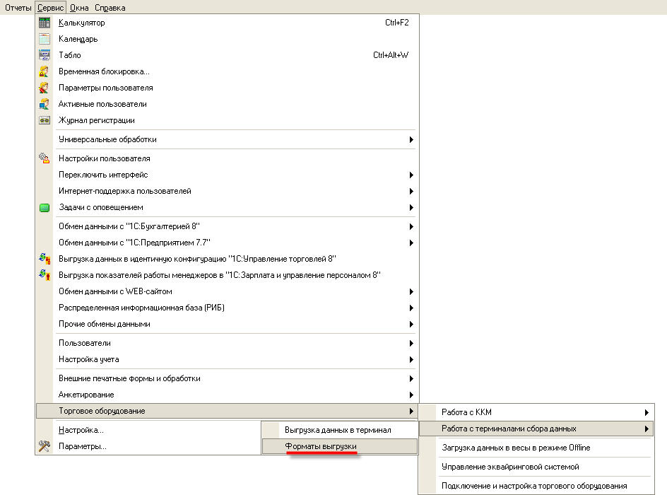 Доступ к данным справочника может быть получен из меню "Сервис" -> "Работа с торговым оборудованием" - "Работа с терминалами сбора данных" -> "Форматы выгрузки".