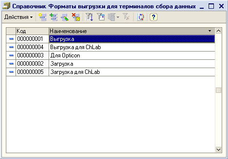 Для задания формата обмена в конфигурациях используется справочник "Форматы выгрузки для терминалов сбора данных" ("ТСДФорматыДанных").