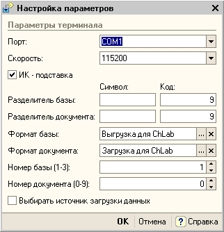В форме настройки необходимо указать параметры подключения и обмена данными. Обратите особое внимание на разделители и номера базы и документа обмена с ТСД, а также форматы выгрузки и загрузки (должны быть настроены в соответствии с задачей в терминале сбора данных).