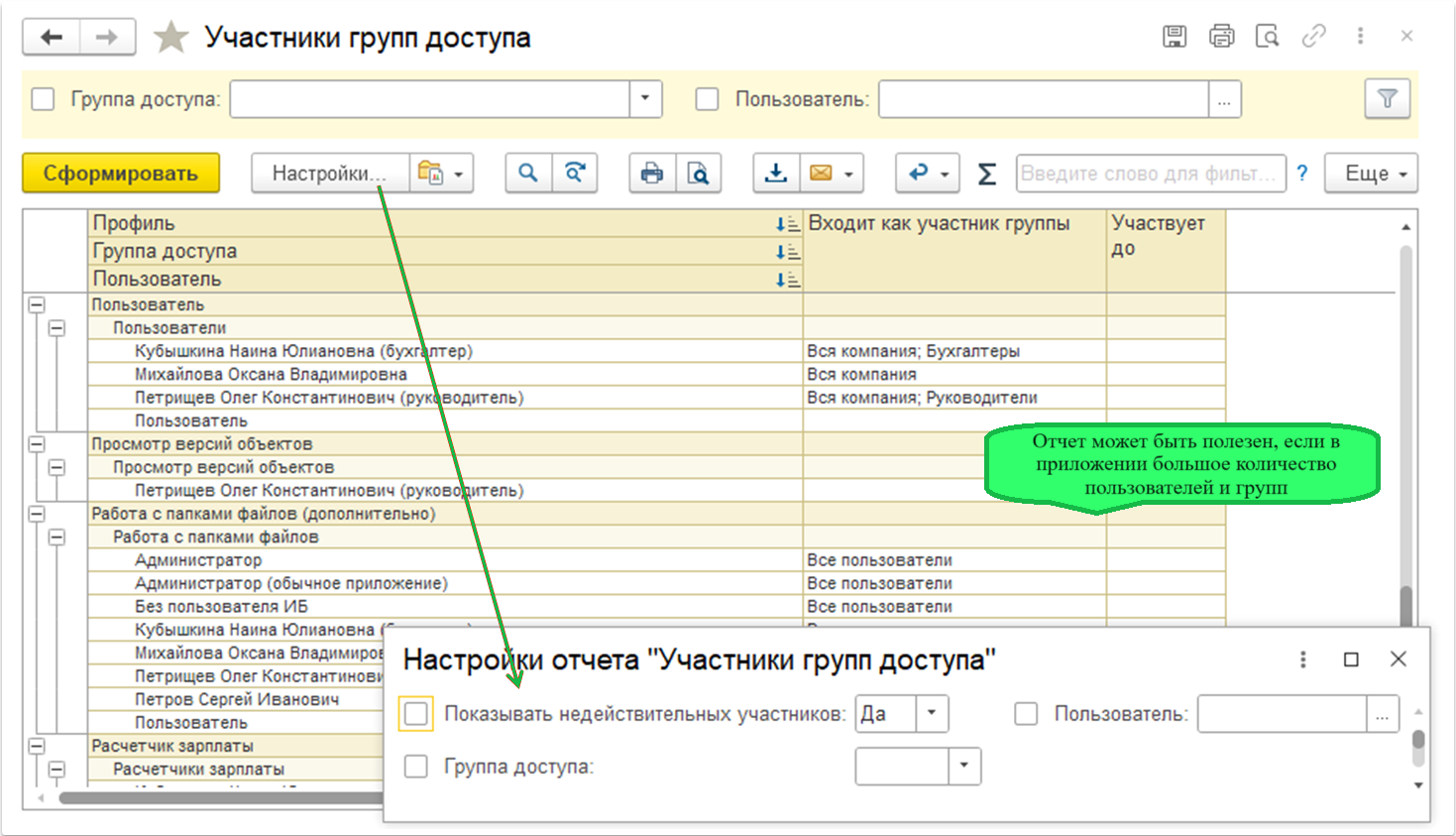 Яндекс.Диск, Google Drive и Интернет (http-сервис).Расширены возможности по анализу прав доступа пользователей к документам и справочникам приложения с учетом ограничений доступа на уровне записей (RLS). Для этого в списках, карточках документов, элементах справочников доступны два контекстных отчета, которые можно найти в меню Еще - Отчеты: