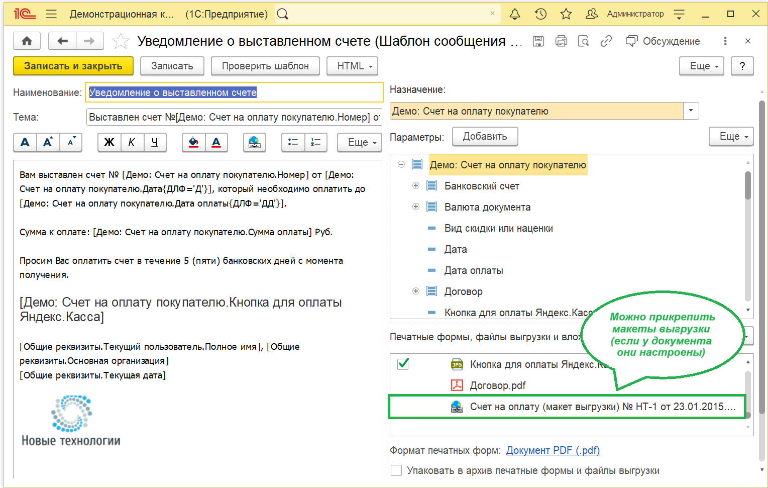 В состав библиотеки включена новая подсистема Выгрузка объектов в файлы, которая используется совместно с подсистемой Печать. Она позволяет выгружать произвольные документы, справочники и другие объекты приложения в файлы различных форматов по настраиваемым макетам. Список макетов выгрузки задается индивидуально для каждого документа в разделе Администрирование - Печатные формы, отчеты и обработки - Макеты файлов выгрузки. В макет можно включить любое поле или табличную часть в нужном порядке, указать формат выходного файла: DBF, XML, JSON, HTML, TXT, XLS, XLSX или MXL. Для выгрузки интересующего документа по макету в файл можно воспользоваться подменю Выгрузить в файл в карточке этого документа, а также в списках и журналах документов. Также можно прикрепить сформированный файл прямо к самому документу, если у него предусмотрены присоединенные файлы, или настроить шаблоны сообщений для рассылки с требуемыми макетами выгрузки. Пример настройки макетов выгрузки см. в демонстрационной базе для документа _ДемоСчетНаОплатуПокупателю.