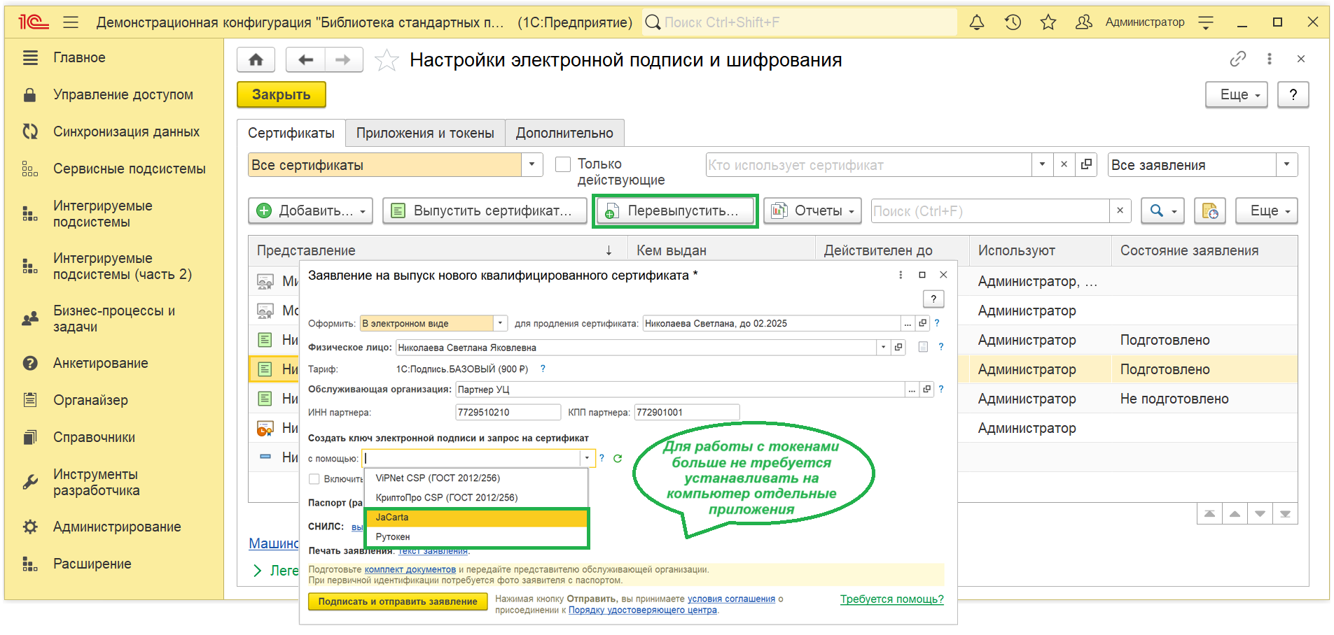 Добавлена возможность настройки ограничения доступа на уровне записей для справочника Сертификаты ключей электронной подписи и шифрования и регистра сведений Заявления на выпуск сертификатов. Настройка ограничения предусмотрена по пользователям и организациям.