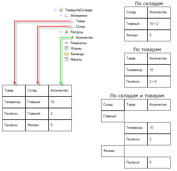 Например, регистр, учитывающий количество товаров на складах, может иметь измерения Товар, Склад. Это позволяет знать количество разных товаров на конкретном складе (разрез учета по складу), количество конкретного товара на разных складах (разрез учета по товару) или количество конкретного товара на конкретном складе (два разреза учета одновременно).